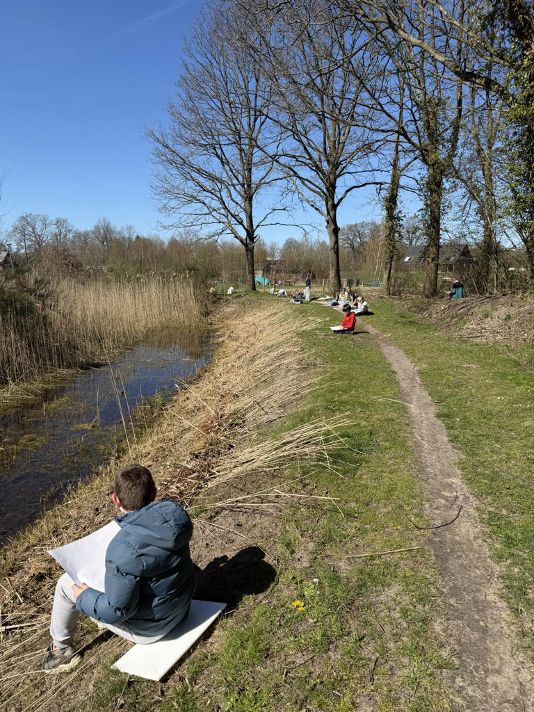 Met een stevig ondergrond en een leeg canvas op schoot en een potlood in de aanslag verspreidde iedereen zich langs het water. Waar ze normaal gesproken snel voorbij rennen, moesten ze nu stilstaan bij de details. De grillige structuur van een boomschors, de precieze nerven van een voorjaarsblad of de schaduw die de lentezon wierp op de ondergrond.