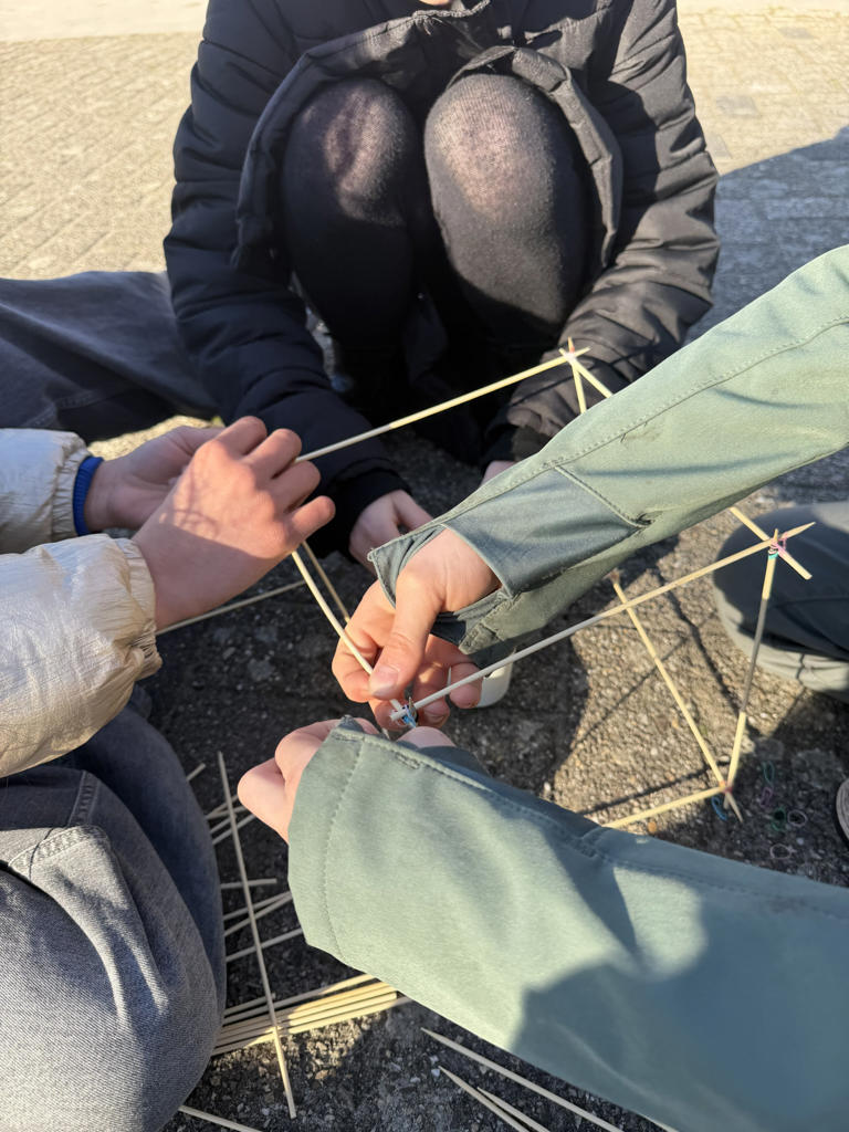 De groep ging vandaag de uitdaging aan met niets meer dan een flinke stapel satéprikkers en een zak vol elastiekjes. Terwijl de vogels floten, het zonnetje lekker scheen, transformeerden zij deze eenvoudige materialen tot “strakke” geometrische vormen. Het doel? Een perfecte kubus bouwen die stevig genoeg was om zelfstandig te blijven staan