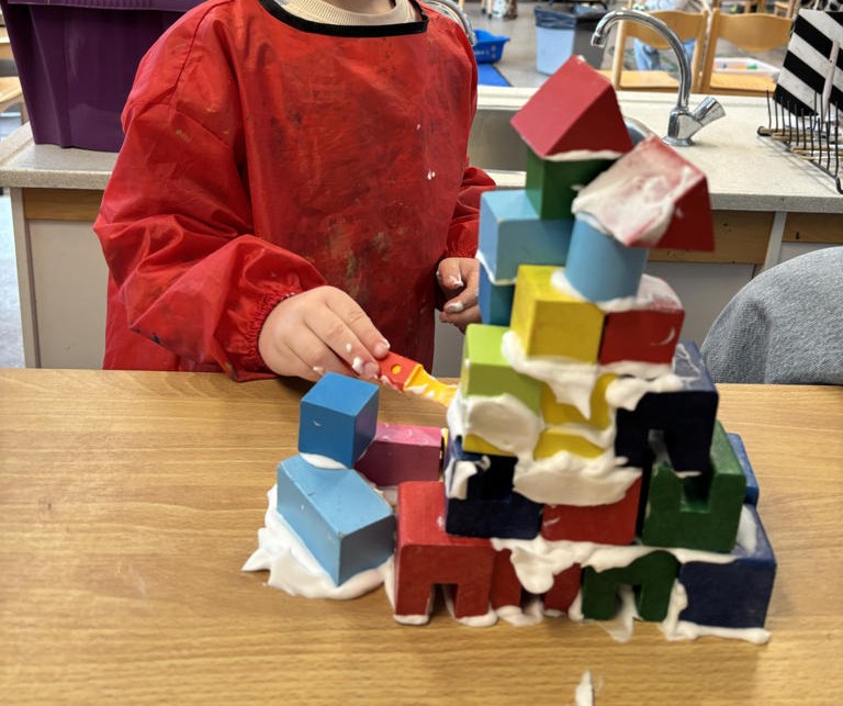 We zitten volop in ons thema bouwen en er is nu ook sinds een paar weken een bouwmarkt in onze klas. Daar kunnen we kwasten, gereedschap en schroeven kopen. Elke dag worden er meerdere klussen opgepakt in de huishoek. Ook in de bouwhoek worden de mooiste bouwwerken gebouwd. Iedereen heeft al een hijskraan geknutseld en ook een huis gebouwd met materiaal naar keuze (lego, duplo, coblo, grote of kleine blokken etc.) en hier vervolgens een bouwtekening naast gemaakt. Het metselen met scheerschuim was ook een groot succes!